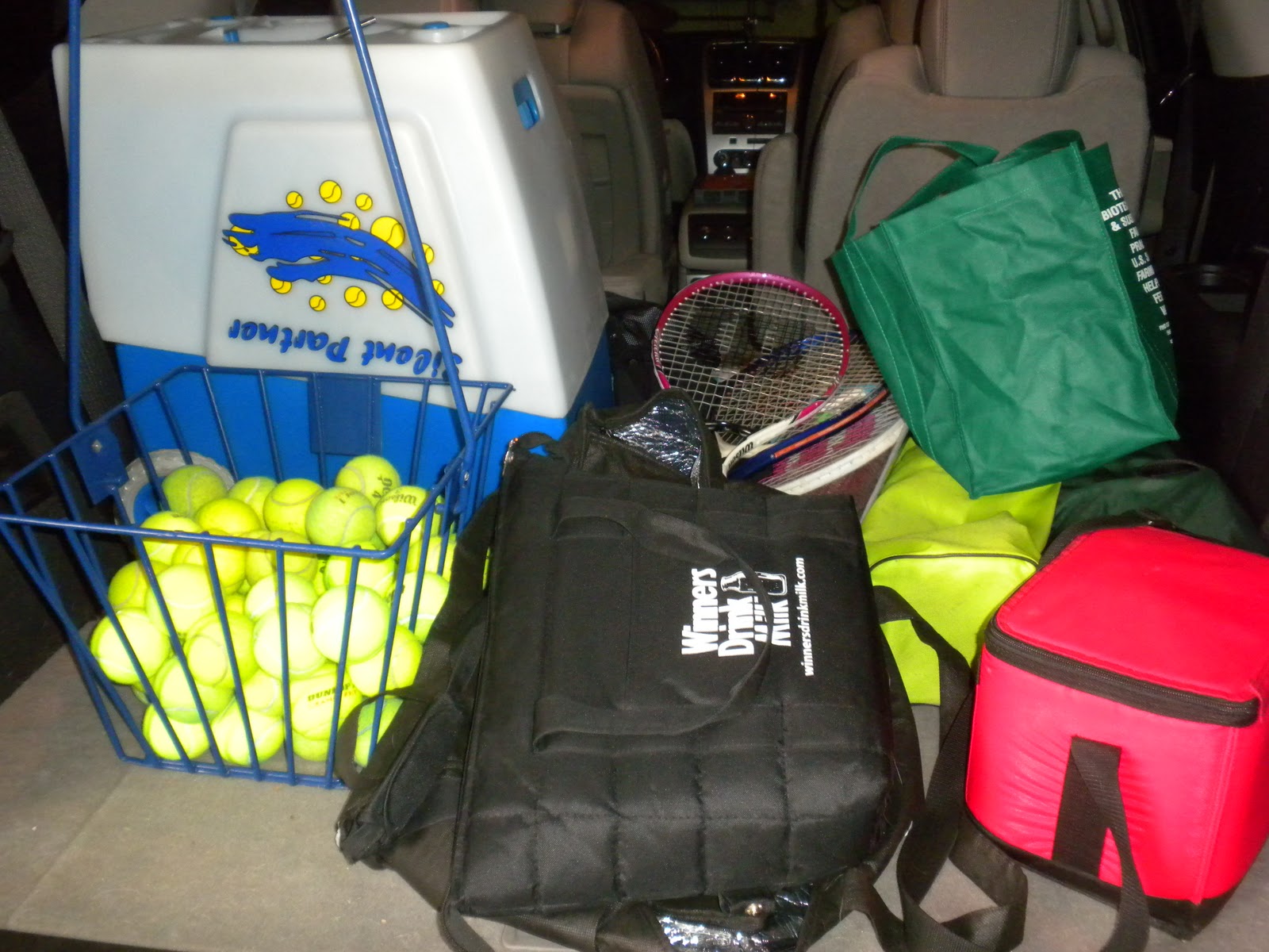 folding camp chairs for watching matches, a cooler with water bottles, rackets, a bag full of rain ponchos and wind breakers and, what?, don't you keep a couple dozen tennis balls and the school's